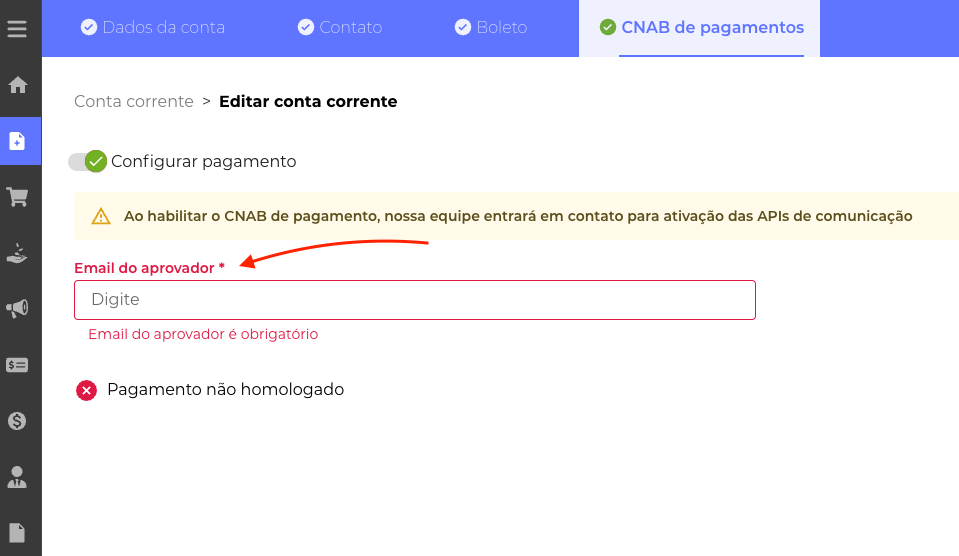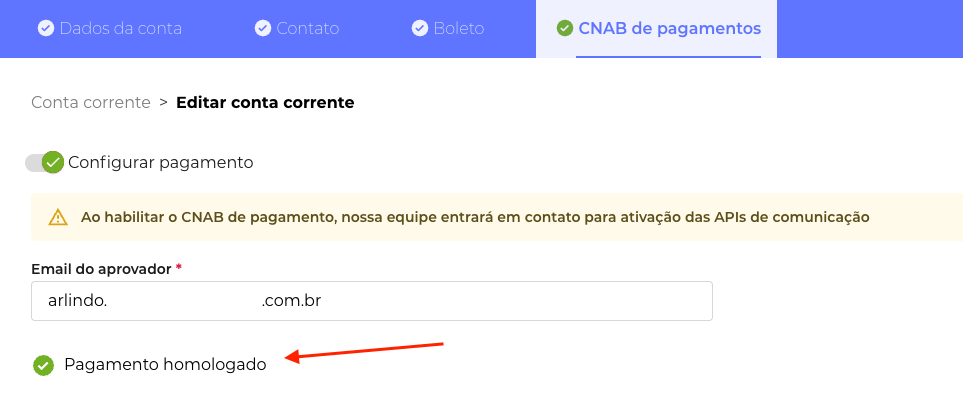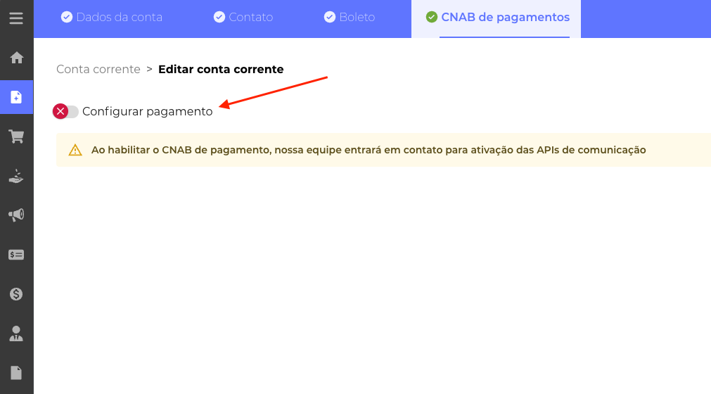 c. Na aba CNAB de pagamentos, ative a flag para configurar o pagamento:
