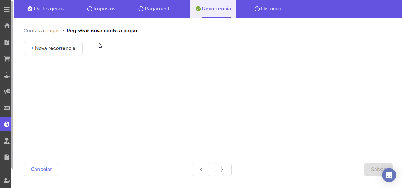 Em Recorrência fica disponível a possiblidade de criar uma repetição para sua conta, seja para uma tratativa de parcelamento ou mesmo uma conta que você paga com determinada frequência.