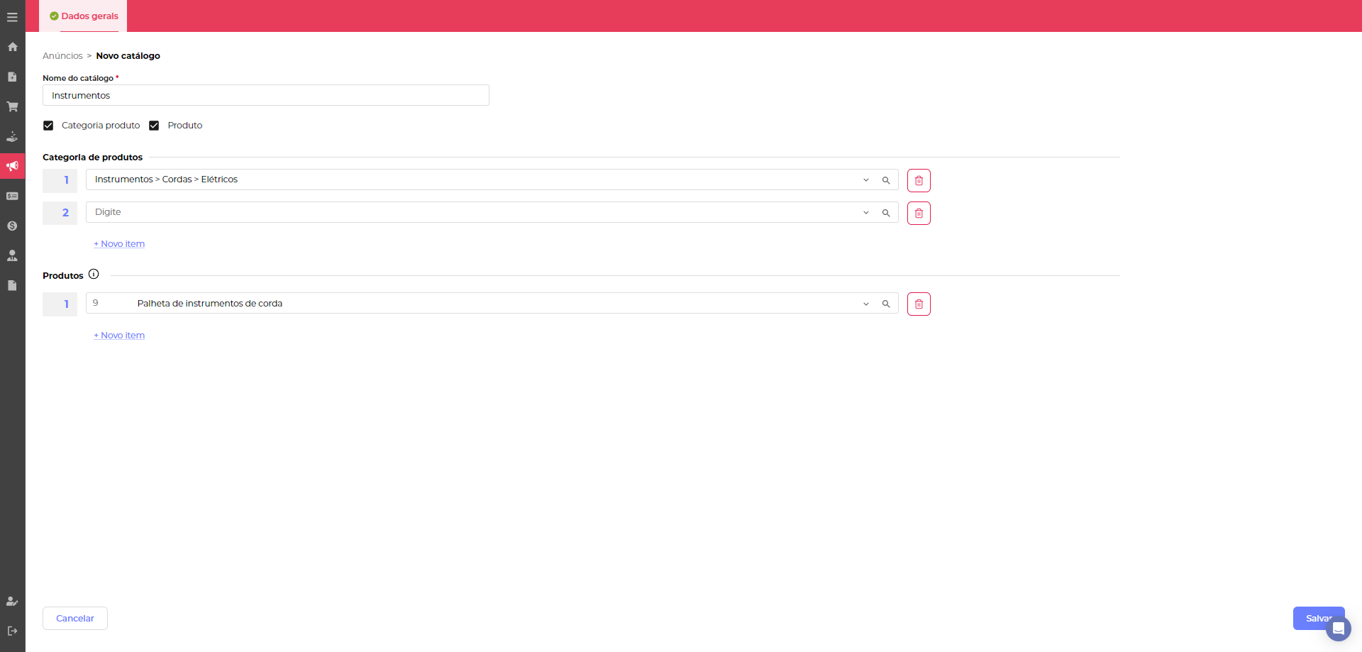 Clicando em Novo, podemos definir o nome do novo catálogo e definir se vamos incluir os produtos nesse catálogo a partir das categorias de produtos ou produtos avulsos.