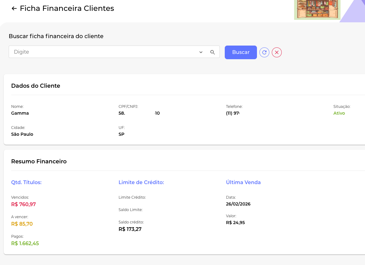 • Segurança na Venda: Saiba instantaneamente se o cliente possui faturas vencidas antes de aprovar uma nova venda.