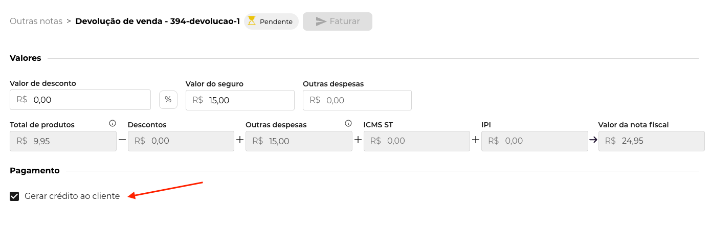 Sempre que um processo de Devolução gera uma entrada de mercadoria, na aba Cobrança você pode marcar a flag de "Gerar crédito ao cliente" e o Nuvy gera automaticamente um crédito na ficha financeira deste parceiro.