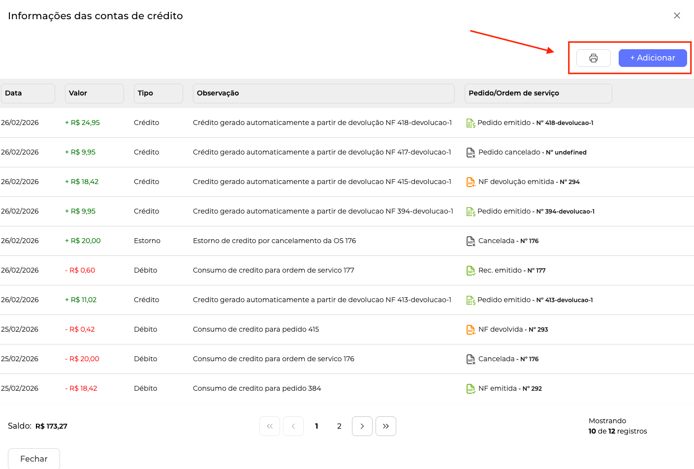 No topo da página você pode +Adicionar um débito ou crédito manuais, como também imprimir a Ficha do seu cliente: