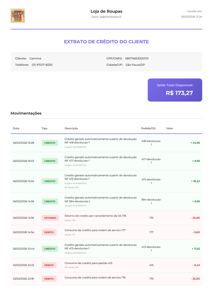 • Gestão de Créditos: Visualize valores oriundos de trocas ou devoluções prontos para uso.