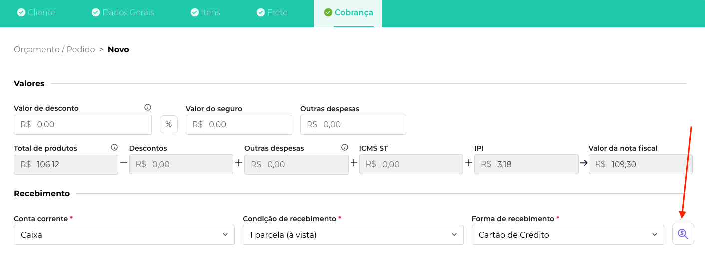 a. Inicie um novo Pedido de Venda ou uma Ordem de Serviço.