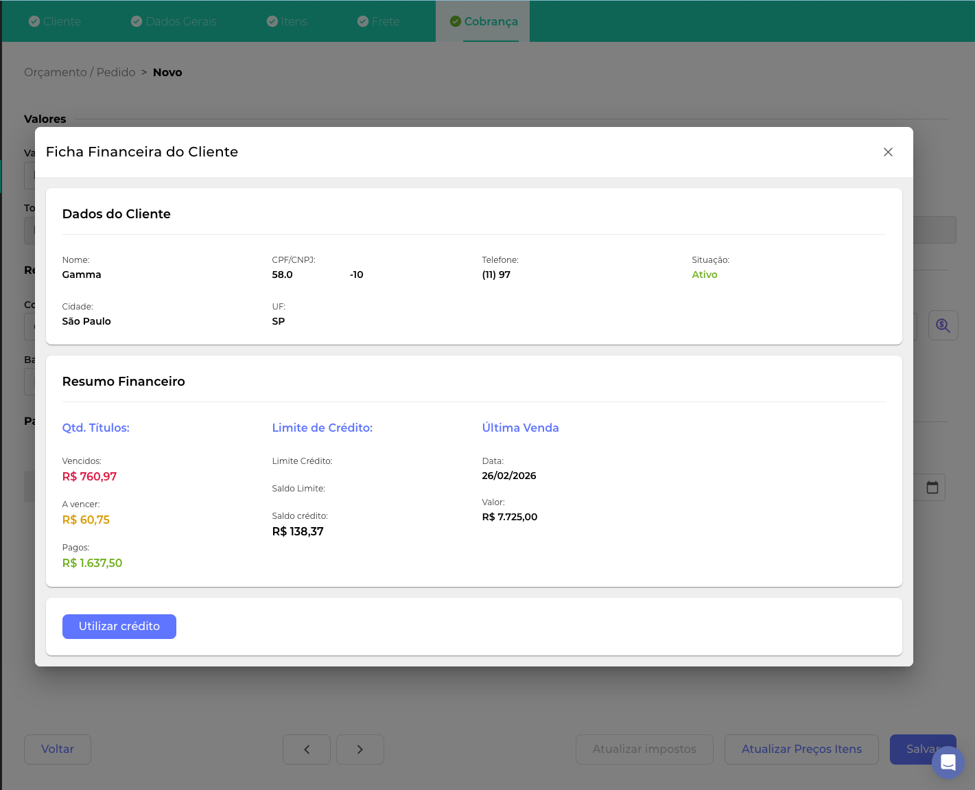 c. Consulte se o cliente possui crédito e clique em Utilizar crédito: