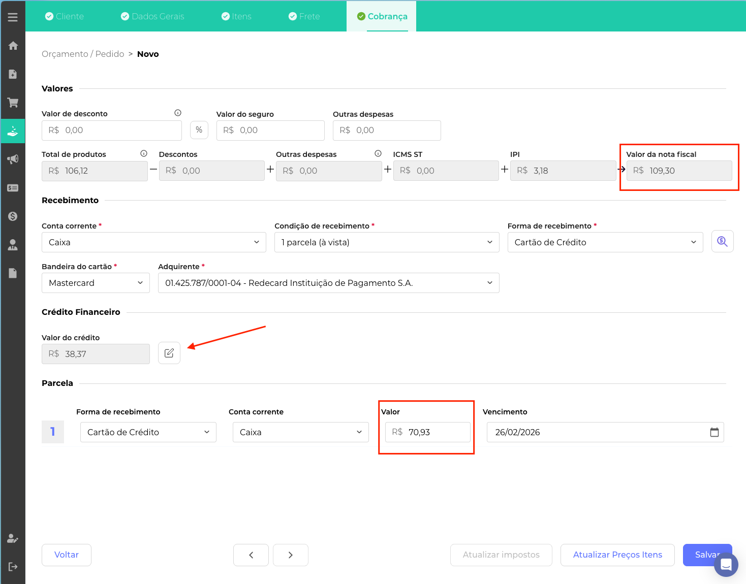 4. Utilizando o Crédito no Pedido ou Ordem de Serviço