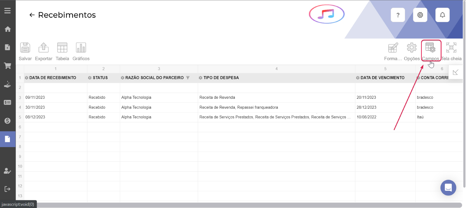 O relatório será criado em um modelo padrão, trazendo as principais informações de suas contas, como Status, Razão social do parceiro, Tipo de receita/despesa, Data de vencimento, Conta corrente, Valor, entre outras. Podendo ser personalizado para atender a necessidade da sua operação, basta clicar na opção "Campos" que você pode adicionar novas colunas relacionadas aos dados cadastrados.