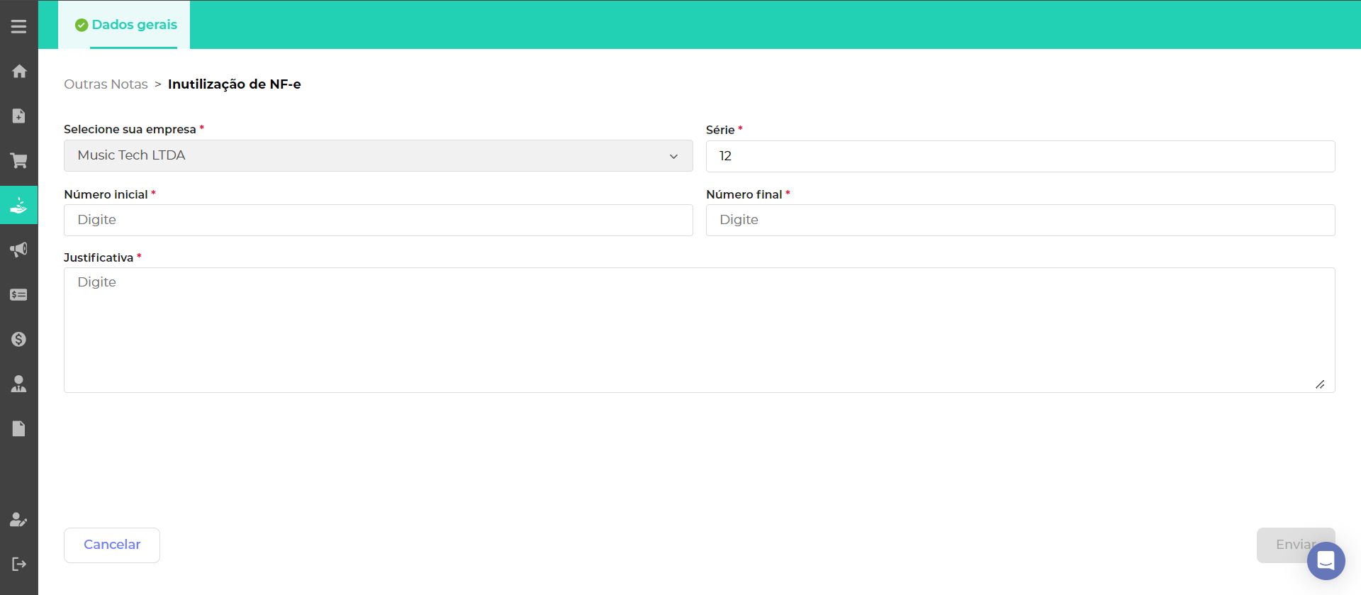 É necessário informar a Série da NF, Número inicial, Número final e Justificativa da inutilização.