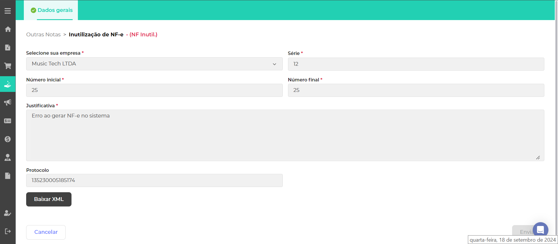 Ao clicar em enviar o Nuvy ERP vai realizar a comunicação com a SEFAZ e disponibilizar a visualização da inutilização, do número de protocolo e o arquivo XML.