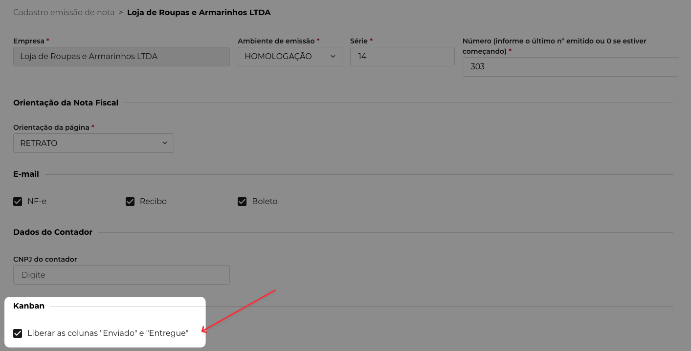 b. Em seguida, localize a empresa desejada no Cadastro de emissão de nota. Dentro do cadastro, role a página até encontrar a seção Kanban.