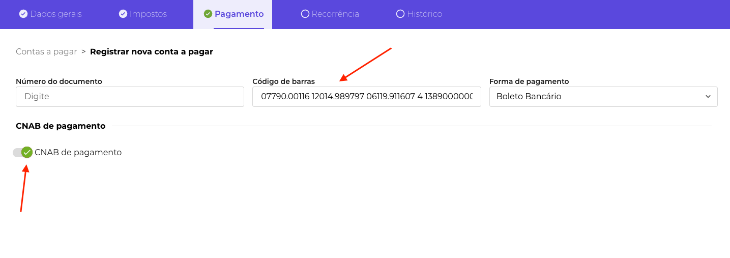 b. Ao cadastrar sua conta a pagar, na aba Pagamento, inclua o código de barras do boleto.